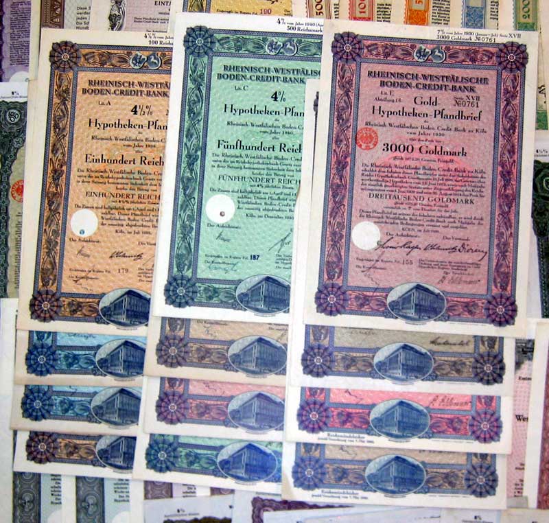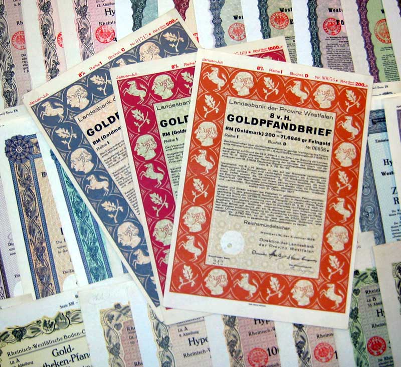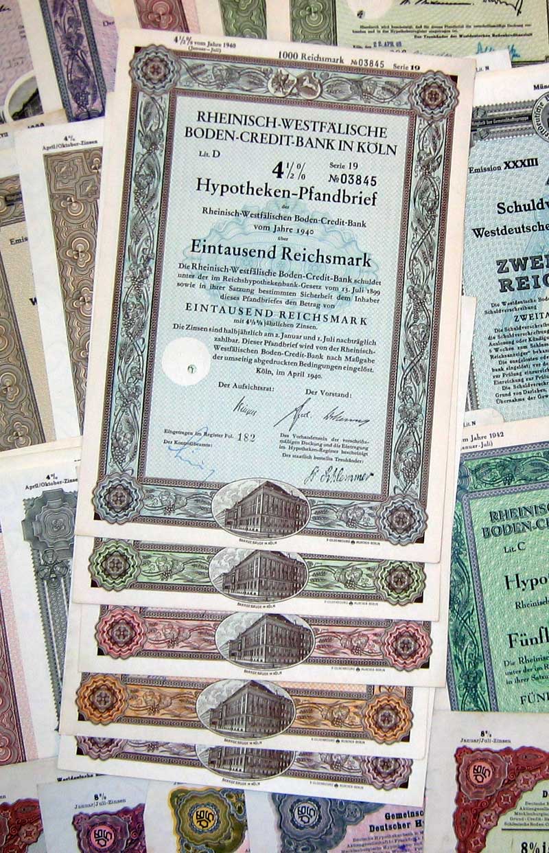 118 verschiedene echte und originale Aktien und Anleihen aus Nordrhein-Westphalen aus den Jahren 1926-1943, alles in sammelwürdiger Erhaltung. Dabei wissentlich keine Knochen bzw. keine 3. Wahl.