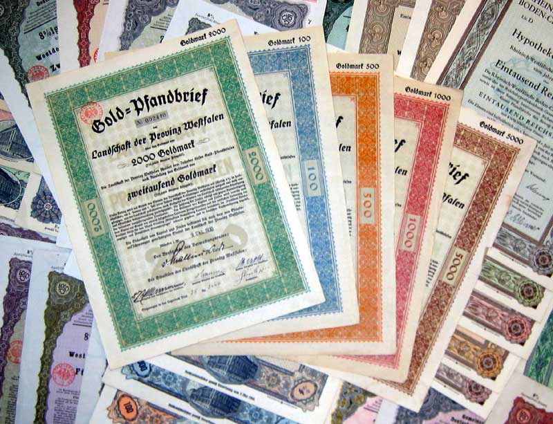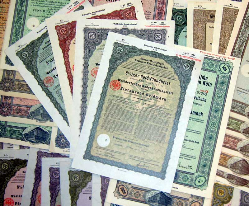 Enthalten sind diverse Banken- und Stahlindustrie-Titel, zum Teil dekorativ, viele Aktien und natürlich Anleihen folgender Unternehmen: