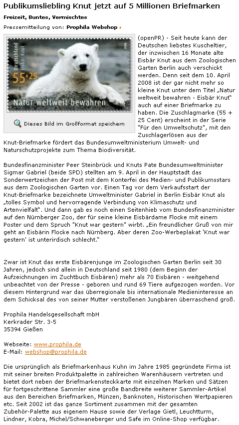 10.04.2008 Publikumsliebling Knut jetzt auf 5 Millionen Briefmarken - Pressemitteilung von Prophila auf openPR.de